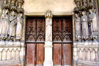 The façade of the church is decorated with statues, restored or replaced in the 19th century. In the center sits the Virgin and Child. To their left are Solomon, the Queen of Saba and Saint Vincent. To the right, Saint Germain, Saint Genevieve (the patron saint of the city) and an angel. The center of the façade is illuminated by a rose, and the truss is topped by a statue of the Archangel Michael. The church’s tower dates back to the 12th century.